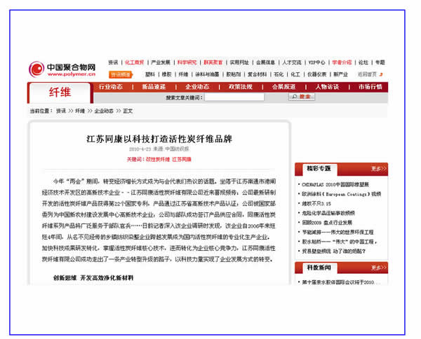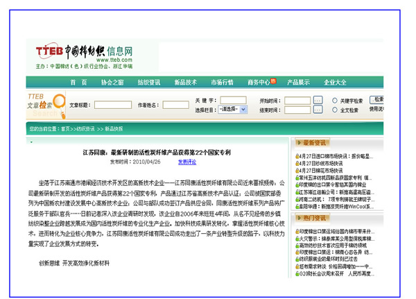 中國棉紡織信息網、中國聚合物網——江蘇同康:最新研制的活性碳纖維產品獲得第22個國家專利