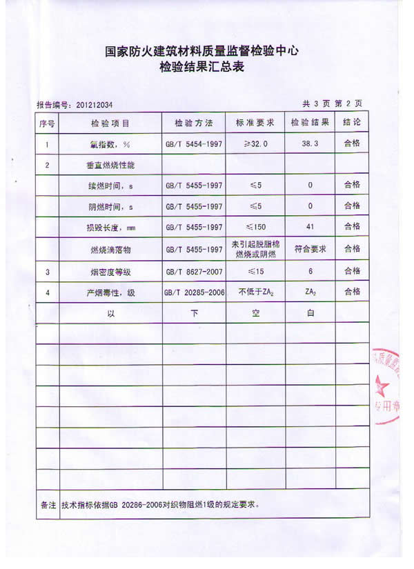 按國家標(biāo)準(zhǔn)GB 20286-2006《公共場所阻燃制品及組件燃燒性能要求和標(biāo)識(shí)》判定,我公司研制的粘膠基炭化防火面料燃燒性能符合織物阻燃1級(jí)的規(guī)定要求,燃燒性能達(dá)到阻燃1級(jí)。該炭化防火面料由粘膠纖維織物為原料,經(jīng)浸漬,炭化處理而成,具有耐高溫、耐明火,無陰燃,無續(xù)燃,無毒無害的特點(diǎn),具有永久性阻燃功能。